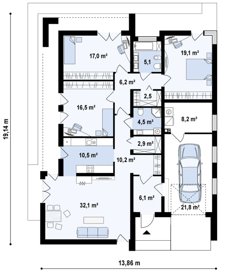 3 pokoje, garderoba, 2 łazienki, kuchnia, spiżarnia, salon + jadalnia, pomieszczenie gospodarcze, garaż